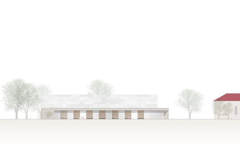 Die Grundschule „Traugott Hirschberger“, ein denkmalgeschütztes Gebäude der 1950er Jahre am Rande der historischen Altstadt von Lübbenau, wird eine neue Zweifeld-Sporthalle erhalten. Der Baukörper der Halle ist in der Höhe gestaffelt, nimmt damit die Traufhöhe der benachbarten Aula auf und fasst den großzügigen Freiraum des Schulgeländes ein. Neben dem Schulsport steht die Halle auch der Vereinsnutzung offen, für Sportveranstaltungen ist eine Zuschauertribüne und ein kleines Foyer geplant. Wie auch schon bei vergleichbaren Sporthallen unseres Büros sind die Nebenräume in Massivbauweise vorgesehen während der Hallenbaukörper und das Tragwerk der Halle als Holzkonstruktion geplant sind. Auf den Dachflächen ist eine großzügige Begrünung in Verbindung mit einer leistungsfähigen PV-Anlage vorgesehen, die den Eigenbedarf der Schule und der Sporthalle weitgehend abdecken wird.